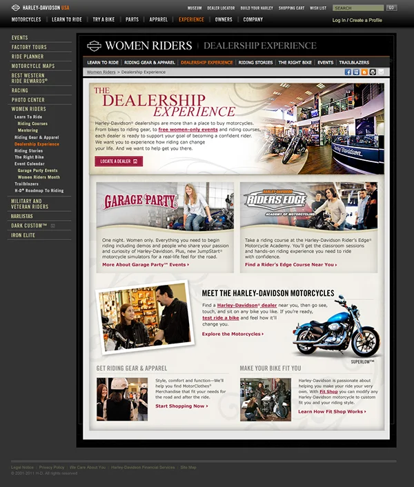What was once a mear online glossy brochure took flight into becoming the world's leading online destination for women riders - both new to riding and experienced riders. The Women Rider's section of the Harley-Davidson website contains all the information a women would need to go from dreaming to riding. Step by step information on everything from bikes to mentoring, from local rally information to a full user generated online community of women sharing their stories of overcoming fear and changing their lives forever. An inspirational and one of kind women's online riding community.