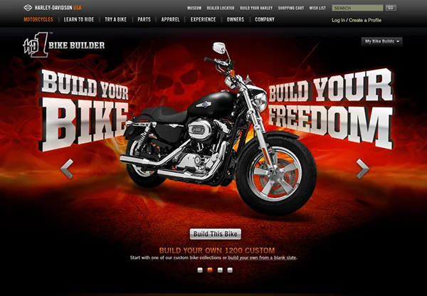The H-D1™ Bike Builder is an online motorcycle customizer that allows a user to build a Harley-Davidson motorcycle that fits their unique style and personality. A user can experiment with the tool by adding parts, components and custom options. Once the user has crafted the bike of their dreams they print out the custom spec and take it to a local dealer for order.